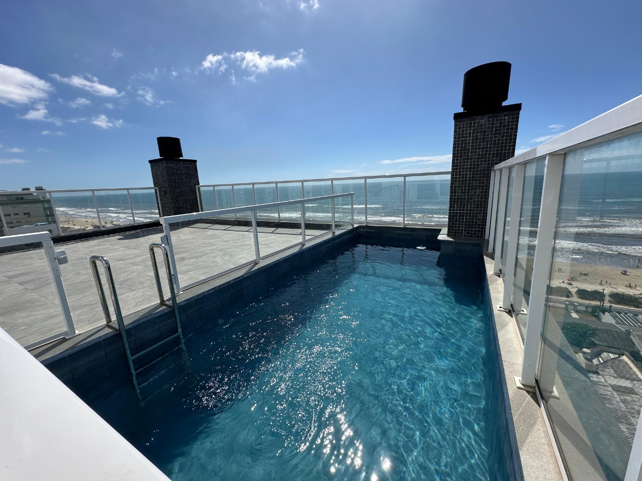 Prédio moderno com elevador e rooftop com piscina e vista para o mar.