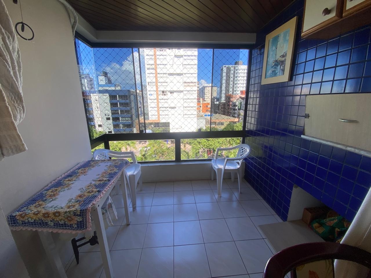 A sacada de frente para a praça, com churrasqueira, é perfeita para aproveitar bons momentos. O imóvel fica mobiliado, possui vaga para carro, ventilador de teto e ar-condicionado instalado. O prédio conta com elevador e hall de entrada.