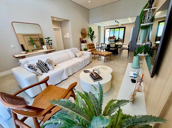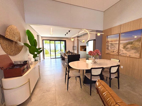Living integrado com sala de estar e jantar, cozinha funcional, espaços iluminados e aconchegantes, além de garagem para maior comodidade.