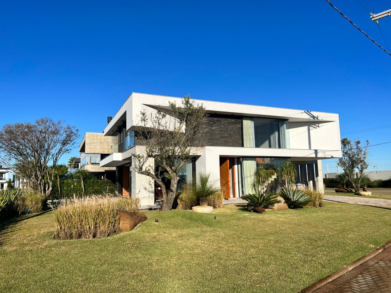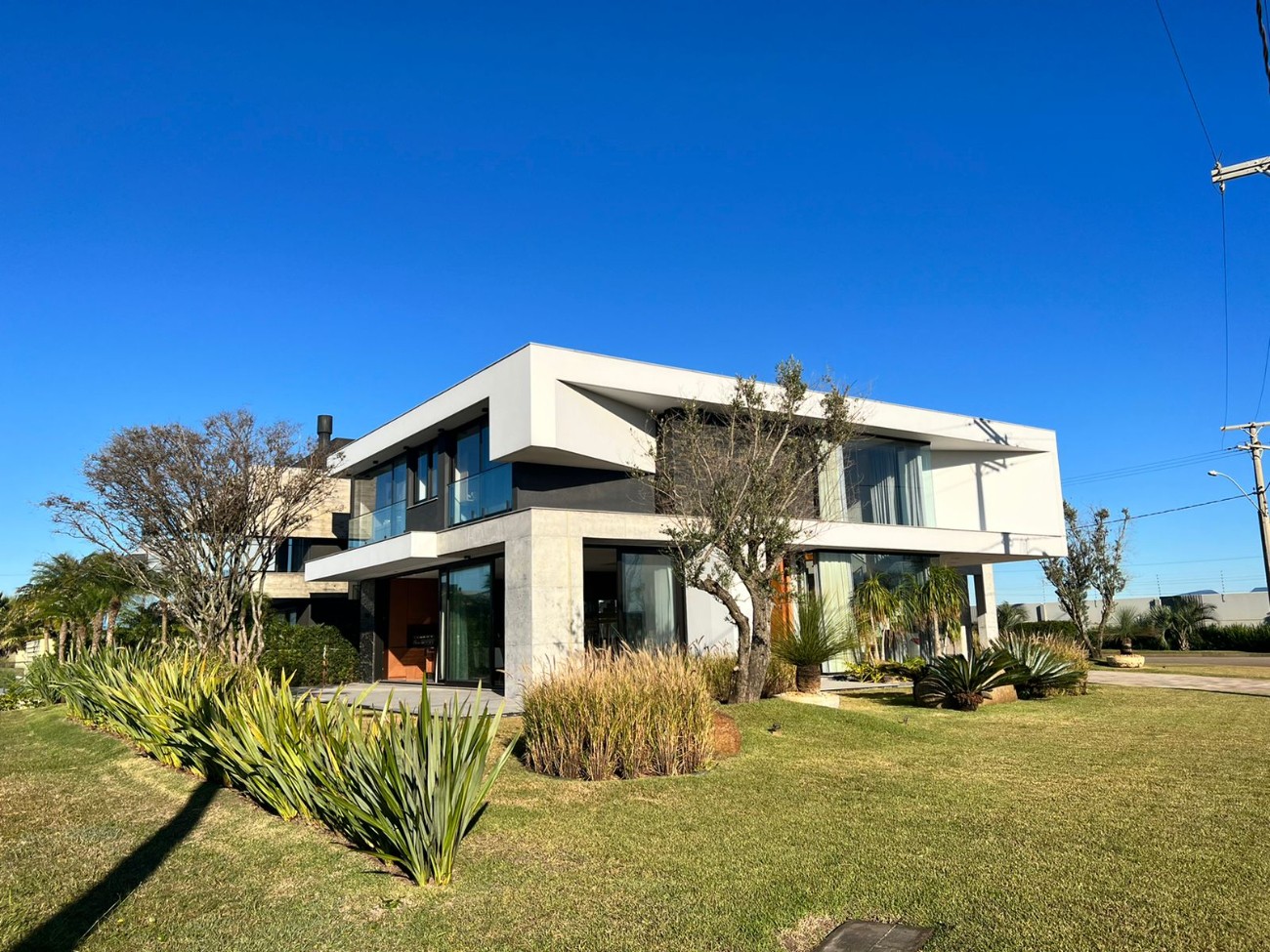Condomínio Sense em Xangri-lá, composto por 5 dormitórios, sendo um térreo, suíte máster com Hidro, todos os dormitórios são suítes, lavabo, cozinha americana, lavanderia, dependência de empregada, espaço gourmet, amplo living em 3 ambientes, lareira, finamente mobiliado e decorado, cortinas automatizadas, piscina de concreto, jardim com paisagismo e irrigação automática, abrigo para 2 carros.