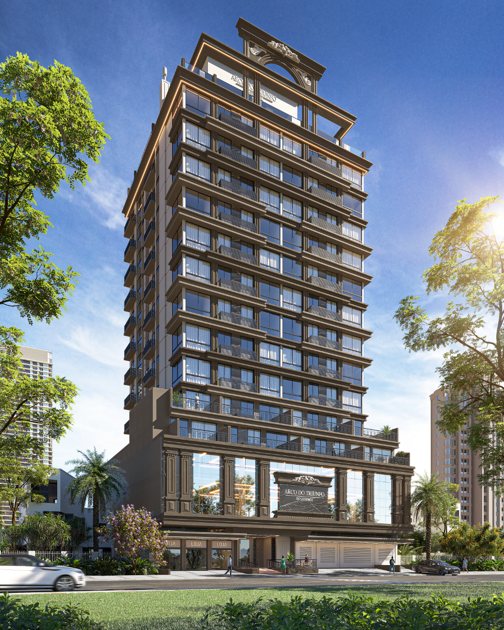 O edifício apresenta uma imponente fachada em estilo neoclássico, com colunas dóricas, frontão elaborado e terraços espaçosos, criando um visual sofisticado e elegante. O hall de entrada é amplo, decorado e climatizado, proporcionando um ambiente acolhedor e moderno. A fachada é revestida com plaquetas, e a iluminação externa em LED destaca a beleza do edifício, além de contar com sensores de presença nas áreas internas e câmeras de segurança para maior proteção. O prédio também possui espera discreta para ar-condicionado, zelador, gás central, antena coletiva, calçada em basalto e lixeiras para coleta seletiva, visando praticidade e sustentabilidade.